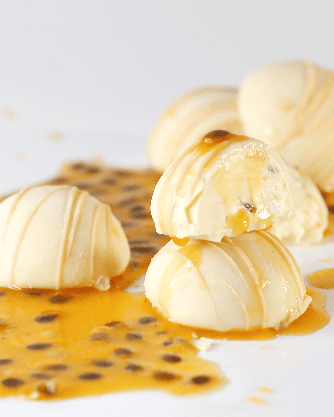 Bombones de crema helada de maracuyá bañados en chocolate blanco.