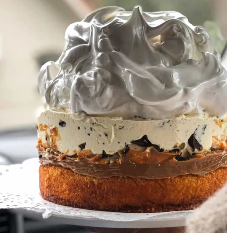 Bizcochuelo de vainilla, dulce de leche, merenguito, chantilly con trozos de semi amargo y merengue suizo.